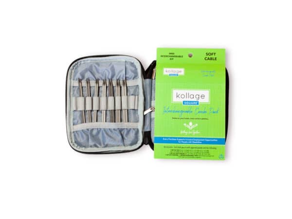 We are pleased to offer the Kollage Square Interchangeable Circular Needle Kit. Made in Canada by the non-profit agency Career Services, Kollage Square needles have, as the name suggests, a square design rather than the traditional rounded knitting needle. The square design can decrease stress and strain for those who love to knit but find the rounded needles painful to work with after a time. Kollage Needles can also enable you to knit faster with more uniform stitches and are perfect for slippery yarns or if you tend to knit too tightly. They are a good alternative for knitters who have arthritis, carpal tunnel, or stiffness in their hands and fingers.